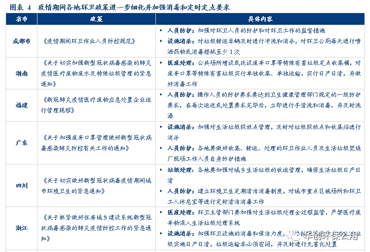 新冠疫情引發(fā)公眾對城市管理問題的廣泛關(guān)注,環(huán)衛(wèi)服務(wù)市場有望實(shí)現(xiàn)進(jìn)一步擴(kuò)圍。疫情發(fā)生后,針對城市環(huán)衛(wèi)管理方面凸顯的臟亂差等問題,全國各省市陸續(xù)出臺一系列通知和規(guī)范文件,明確了環(huán)衛(wèi)服務(wù)領(lǐng)域應(yīng)對新型冠狀病毒肺炎疫情的工作方案。各項(xiàng)政策文件中分別在醫(yī)廢處理、日常垃圾清理、環(huán)衛(wèi)設(shè)施消殺、公共環(huán)境消毒和環(huán)衛(wèi)人員防護(hù)等領(lǐng)域提出了具體的要求,為社會各界應(yīng)對新冠疫情提供了指導(dǎo)。對于環(huán)衛(wèi)工作的高標(biāo)準(zhǔn)、精細(xì)化、專業(yè)化的要求,無疑會加大對市政環(huán)衛(wèi)部門工作的挑戰(zhàn),有利于對專業(yè)環(huán)衛(wèi)公司及機(jī)構(gòu)提供環(huán)衛(wèi)服務(wù)的需求釋放,環(huán)衛(wèi)服務(wù)市場化進(jìn)程有望進(jìn)一步加速。