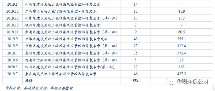 而自2019年年底起,各地方政府的配套政策密集且高效落地,有望成為各地大力啟動修復(fù)工程的信號。截止2019年底,華北地區(qū)、西北和經(jīng)濟(jì)發(fā)達(dá)地區(qū)均在土壤政策方面大力推進(jìn)。2020年,山東、廣東、四川等部分省市發(fā)布具體土壤防治方案;而在操作層面上云南、上海、廣東等地已經(jīng)出臺明確的修復(fù)流程操作要求。此外,截止2020年5月,全國所有省級行政區(qū)已出臺土壤污染風(fēng)險管控和修復(fù)名錄,累計(jì)需修復(fù)地塊554個,面積約5000萬m2。土壤修復(fù)名錄的出臺一方面意味著多省的土壤詳查已經(jīng)轉(zhuǎn)移至工業(yè)場地領(lǐng)域,另一方面隨著土壤詳查的基本完成,行業(yè)進(jìn)入修復(fù)周期,需求有望持續(xù)高增。