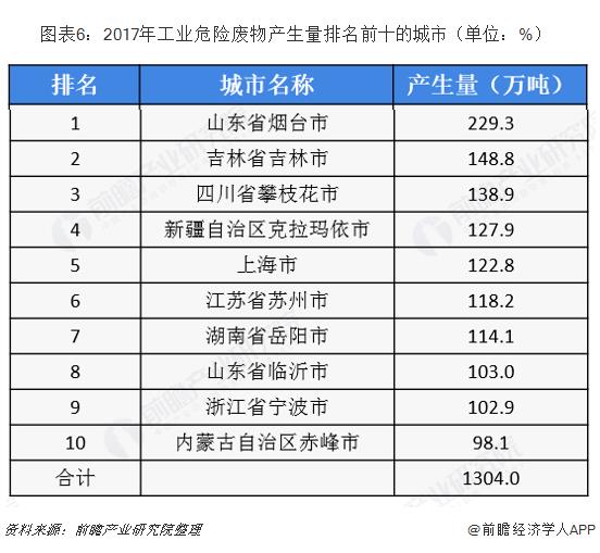 ? ? 從地區(qū)上來看,2017年工業(yè)危廢排名前十的城市共計產(chǎn)生工業(yè)危廢1304萬噸,占全部信息發(fā)布城市產(chǎn)生總量的32.5%。排名前三的分別為山東省煙臺市、吉林省吉林市和四川省攀枝花市,產(chǎn)生量分別為229.3萬噸、148.8和138.9萬噸。與一般工業(yè)固廢不同的是,山東省工業(yè)危廢產(chǎn)生量較多,在前十城市中占據(jù)兩席;西部地區(qū)入榜反而較少,主要原因為西部工業(yè)以一般工業(yè)為主,沿海地區(qū)工業(yè)結(jié)構(gòu)偏向高端制造。