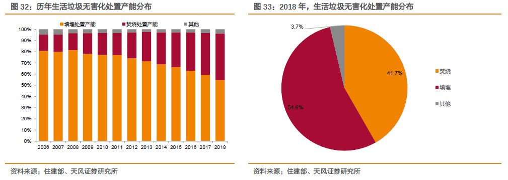 垃圾填埋是垃圾焚燒的最主要競(jìng)爭(zhēng)工藝,近年來(lái)產(chǎn)能增速明顯放緩。生活垃圾無(wú)害化處置方式主要包括填埋、焚燒、堆肥等。2018年,填埋和焚燒處置產(chǎn)能占無(wú)害化處置產(chǎn)能的比例分別為54.6%、41.7%。填埋在早期因技術(shù)簡(jiǎn)單、成本低等特點(diǎn)得到大規(guī)模應(yīng)用,但占地面積較大,與緊缺的土地資源天然具有對(duì)抗性,近年來(lái)產(chǎn)能增速明顯放緩;焚燒具有占地面積小、能源利用高等特點(diǎn),對(duì)垃圾填埋的替代作用逐年顯現(xiàn),產(chǎn)能占比持續(xù)提升。