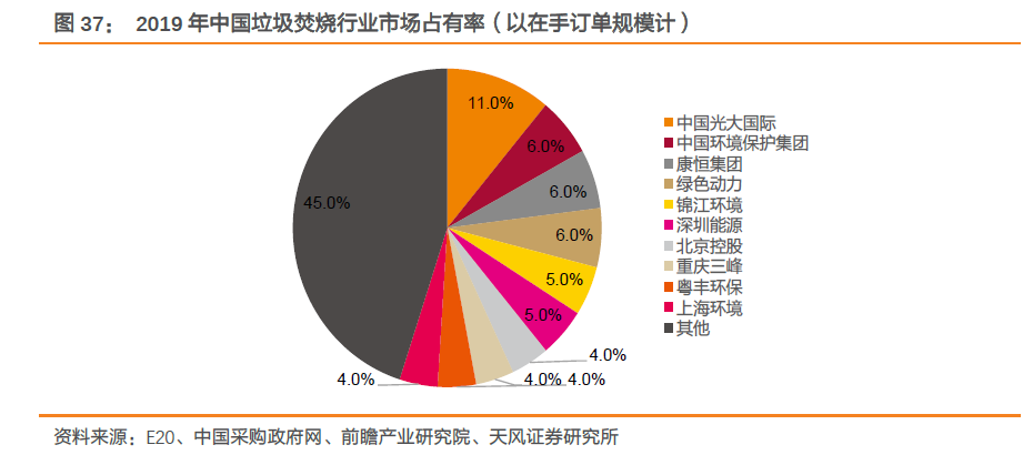 垃圾焚燒企業(yè)加速“跑馬圈地”,在手訂單規(guī)模不斷擴(kuò)大。前些年在一系列政策大力支持下,各城市競(jìng)相建立垃圾焚燒發(fā)電廠,并在國(guó)內(nèi)掀起投資并購(gòu)浪潮。行業(yè)外企業(yè)通過(guò)并購(gòu)快速切入垃圾焚燒領(lǐng)域,行業(yè)內(nèi)企業(yè)借助并購(gòu)迅速擴(kuò)大自身規(guī)模。例如,2011年,水務(wù)領(lǐng)域龍頭首創(chuàng)股份通過(guò)收購(gòu)新環(huán)保能源,將業(yè)務(wù)拓展至固廢處理領(lǐng)域;2013年,瀚藍(lán)環(huán)境收購(gòu)創(chuàng)冠環(huán)保(中國(guó))有限公司100%股權(quán),垃圾規(guī)劃處理能力一年內(nèi)提升四倍。并購(gòu)趨勢(shì)下,龍頭企業(yè)在手規(guī)模不斷擴(kuò)大,截至2019年,在手訂單規(guī)模前十企業(yè)市占率達(dá)55%,前三占有率分別為11/6/6%。