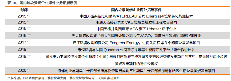 海外拓展穩(wěn)步推進(jìn),龍頭企業(yè)擁有多個(gè)海外運(yùn)營(yíng)項(xiàng)目。隨著國(guó)內(nèi)焚燒設(shè)備及技術(shù)的日漸成熟,國(guó)內(nèi)垃圾焚燒發(fā)電企業(yè)已由早期的技術(shù)引進(jìn)者轉(zhuǎn)向設(shè)備、技術(shù)輸出者,并通過(guò)海外并購(gòu)等方式迅速開(kāi)拓海外市場(chǎng)。目前已有多家企業(yè)擁有數(shù)個(gè)海外投資運(yùn)營(yíng)的垃圾焚燒發(fā)電項(xiàng)目,涵蓋東南亞、歐洲乃至美洲等多個(gè)區(qū)域。