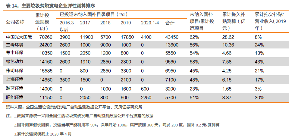 存量項(xiàng)目拖欠的補(bǔ)貼解決后,企業(yè)現(xiàn)金流有望得到改善。補(bǔ)貼發(fā)放不僅可以通過(guò)改善現(xiàn)金流,降低財(cái)務(wù)杠桿來(lái)減少財(cái)務(wù)費(fèi)用,同時(shí)應(yīng)收賬款收回,前期應(yīng)收賬款計(jì)提減值沖回,也將增加公司當(dāng)期業(yè)績(jī)。截止2020年4月,全國(guó)垃圾焚燒運(yùn)營(yíng)規(guī)模50萬(wàn)噸/日,其中未納入目錄項(xiàng)目占比約48%,累計(jì)拖欠補(bǔ)貼金額約130億元。從企業(yè)具體情況來(lái)看,我們測(cè)算出2016-2020年各家企業(yè)的累計(jì)拖欠補(bǔ)貼,并以累計(jì)拖欠補(bǔ)貼金額占2019年?duì)I收的比例作為利好彈性的觀測(cè)值。若存量補(bǔ)貼發(fā)放,對(duì)垃圾焚燒發(fā)電企業(yè)將帶來(lái)較大的現(xiàn)金流改善。