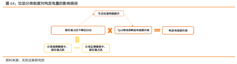 ⑤由垃圾分類導(dǎo)致的噸發(fā)提升量:據(jù)《深圳市生活垃圾分類對(duì)垃圾焚燒影響的研究》相關(guān)內(nèi)容,我們推算出當(dāng)濕垃圾在入爐垃圾中的占比降低1pct時(shí),噸垃圾發(fā)電量可以提升2.2-3.0Kwh,保守假定濕垃圾占比下降1pct會(huì)帶來(lái)噸發(fā)電量提升2.2Kwh。