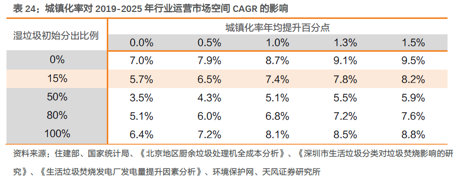 綜合考慮垃圾分類帶來(lái)的“量減”+“熱值升”,以及城鎮(zhèn)化率提升、技術(shù)工藝優(yōu)化等影響因素,據(jù)我們測(cè)算,2019-2025年垃圾焚燒行業(yè)運(yùn)營(yíng)收入CAGR約7%,垃圾分類減量化影響下仍有增長(zhǎng)空間。核心假設(shè)如下: