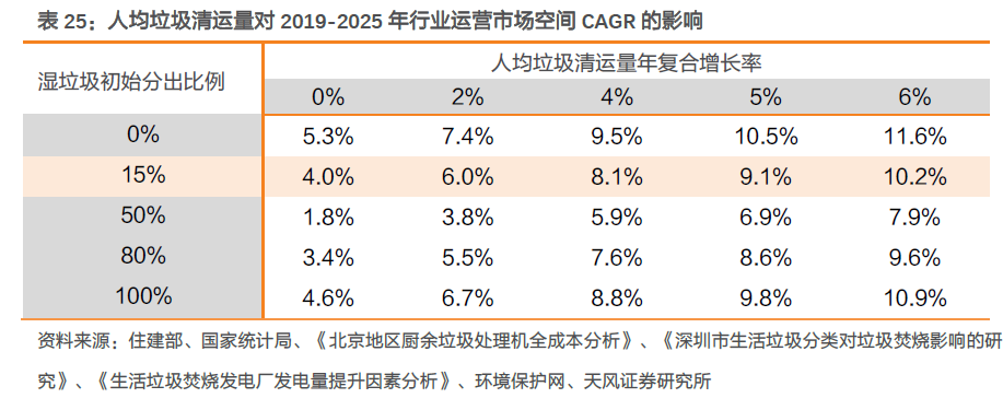從靜態(tài)時(shí)點(diǎn)看,相較垃圾分類前,分類后焚燒處置量會(huì)出現(xiàn)一定下滑。但從長(zhǎng)期動(dòng)態(tài)視角看,目前我國(guó)經(jīng)濟(jì)仍處于穩(wěn)步發(fā)展過(guò)程中,城鎮(zhèn)化率仍在持續(xù)提升,人均垃圾產(chǎn)量仍處于緩慢上升通道,且焚燒占比仍有提升空間,焚燒處置量有望逐年增加,疊加垃圾分類及技術(shù)進(jìn)步驅(qū)動(dòng)下的噸上網(wǎng)電量提升,垃圾焚燒發(fā)電行業(yè)運(yùn)營(yíng)市場(chǎng)空間有望保持正增長(zhǎng)。綜合各類影響因素,我們預(yù)計(jì)2019-2025年,垃圾焚燒發(fā)電行業(yè)運(yùn)營(yíng)收入CAGR約7%。