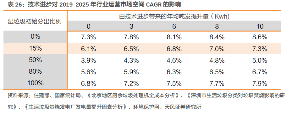 ⑥由技術(shù)工藝優(yōu)化導(dǎo)致的噸發(fā)提升量:據(jù)《生活垃圾焚燒發(fā)電廠發(fā)電量提升因素分析》介紹,李坑一廠借助中溫超高壓技術(shù),噸垃圾發(fā)電量達(dá)350~360kWh,以及在垃圾熱值相近的情況下,中溫次高壓余熱鍋爐發(fā)電量增加17%。我們假定技術(shù)優(yōu)化帶來(lái)噸發(fā)電量提升50Kwh,由2019年300Kwh線性提升至2025年350Kwh。