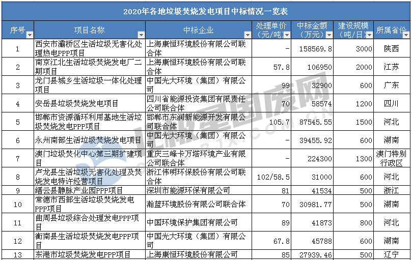 北極星垃圾發(fā)電網(wǎng)匯總了2020年各省、市、自治區(qū)部分垃圾焚燒發(fā)電項目中標(biāo)情況,主要數(shù)據(jù)來源中國政府采購網(wǎng)以及省級政府采購網(wǎng),如有遺漏,敬請諒解,如下表所示(僅供參考):