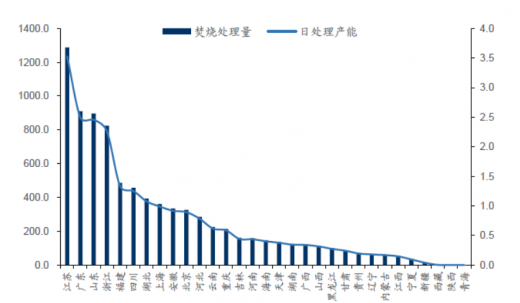 2017年全國各省生活垃圾焚燒量(萬噸)及日處理產(chǎn)能(萬噸/日)