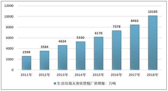 2011-2018年中國(guó)生活垃圾無(wú)害焚燒廠處理規(guī)模