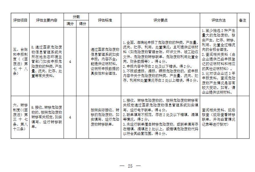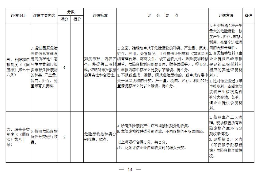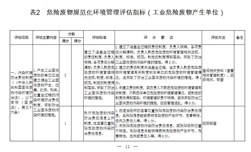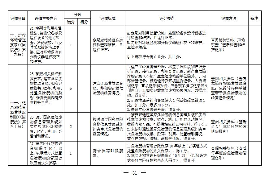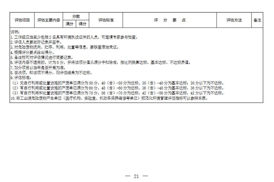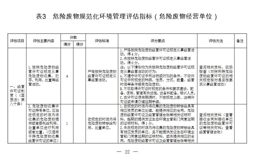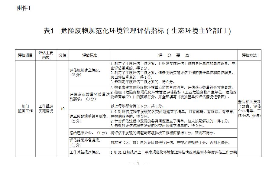(三)評估安排。各省級生態(tài)環(huán)境主管部門應于每年1月31日前按照《評估指標》表1進行自評打分,總結上一年度危險廢物規(guī)范化環(huán)境管理評估情況(要求見附件3),制定本年度評估工作方案,并將上述3項材料報送生態(tài)環(huán)境部,抄送生態(tài)環(huán)境部固體廢物與化學品管理技術中心。