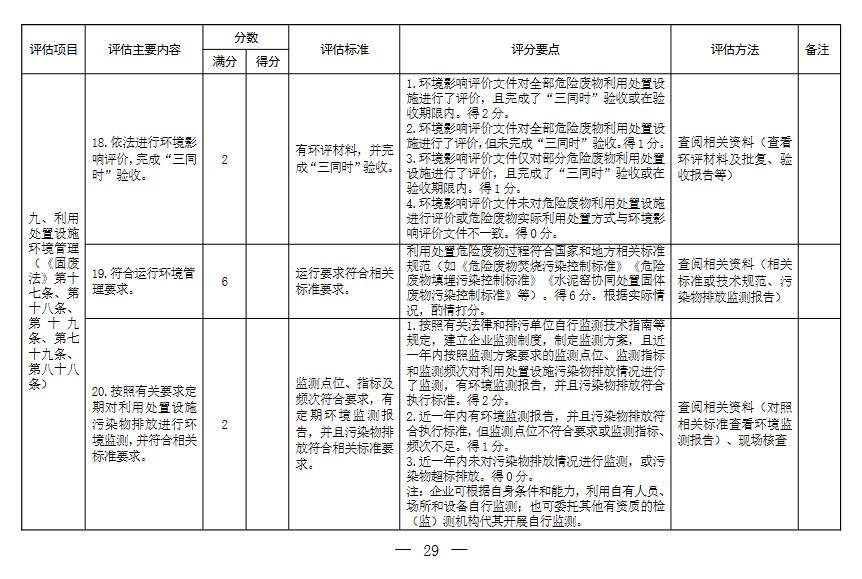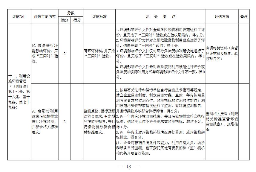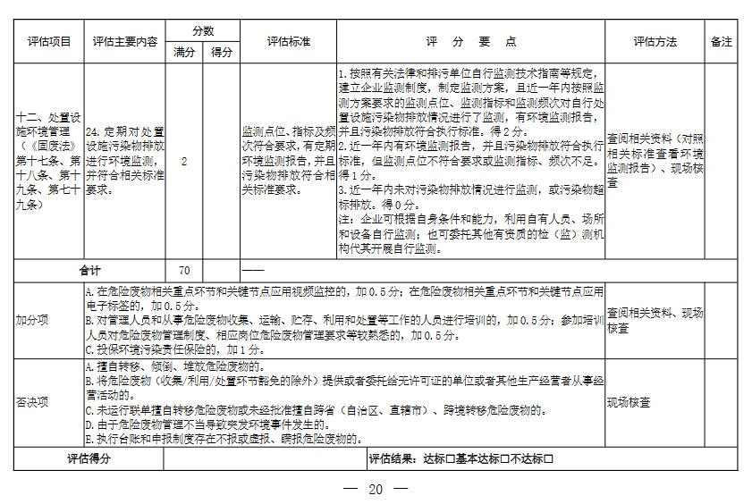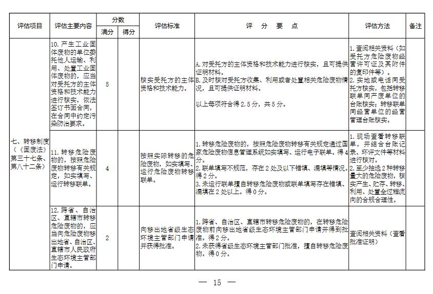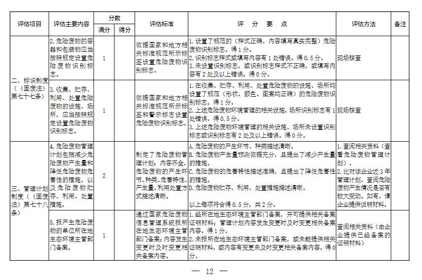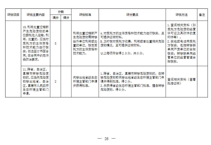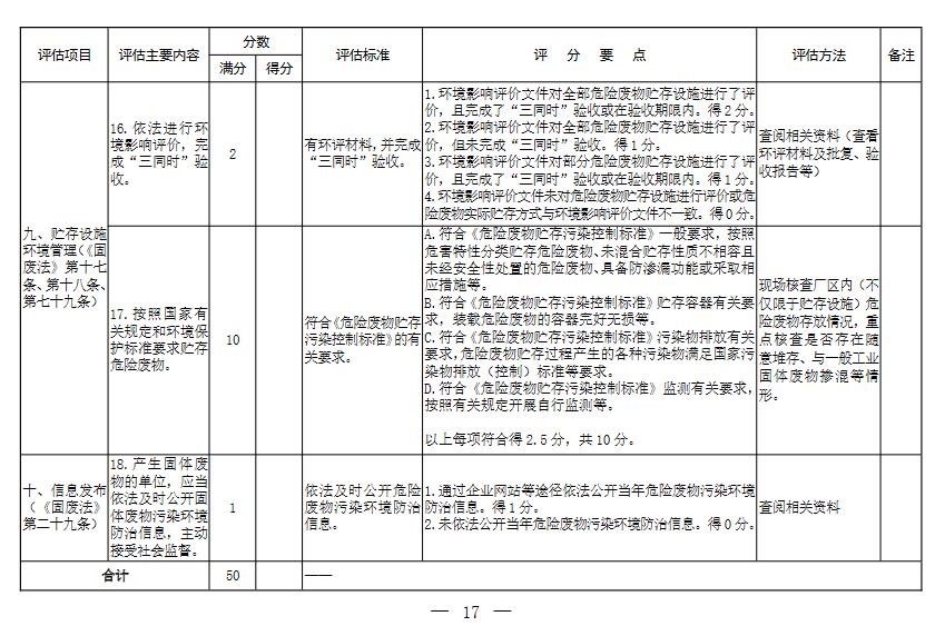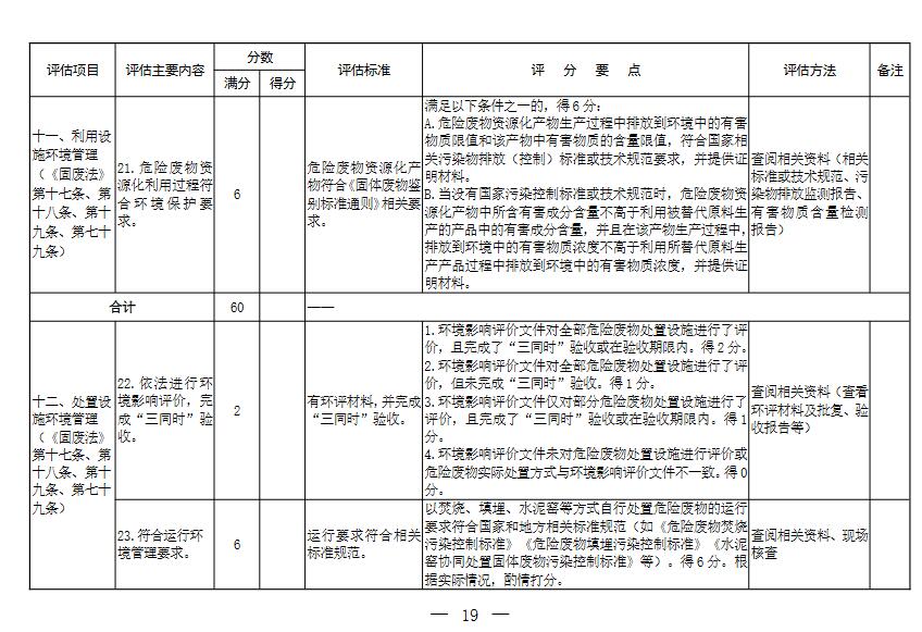 (三)評估安排。各省級生態(tài)環(huán)境主管部門應于每年1月31日前按照《評估指標》表1進行自評打分,總結上一年度危險廢物規(guī)范化環(huán)境管理評估情況(要求見附件3),制定本年度評估工作方案,并將上述3項材料報送生態(tài)環(huán)境部,抄送生態(tài)環(huán)境部固體廢物與化學品管理技術中心。