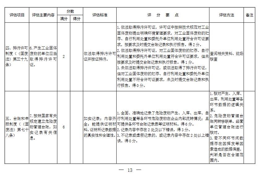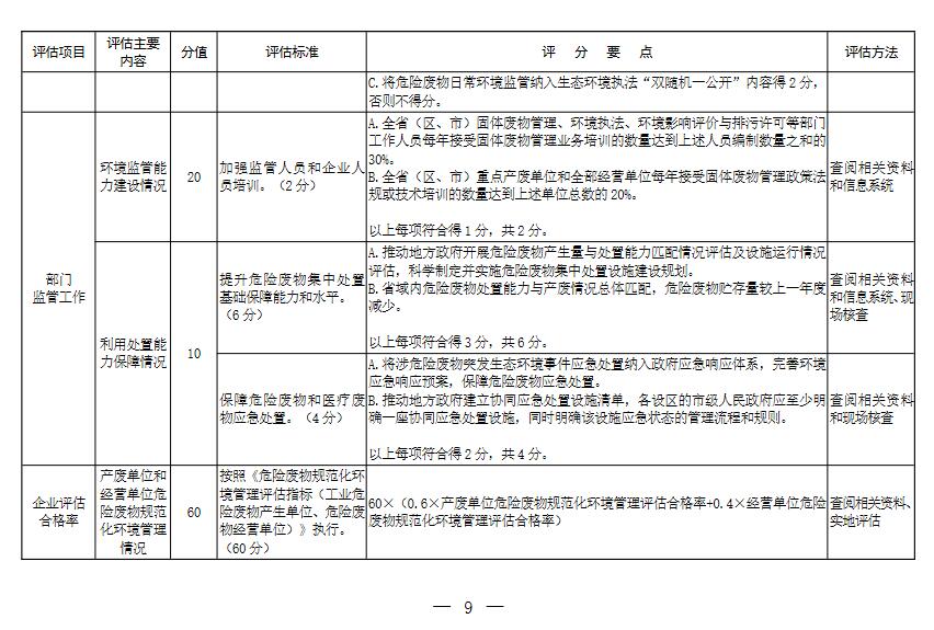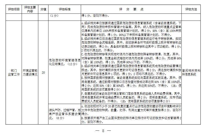 (二)推動政府和部門落實監(jiān)管責任。合理設立評估指標,推動各地和相關部門落實危險廢物監(jiān)管和利用處置能力保障等工作的組織領導、方案編制、責任落實、能力建設、工作成效等事項。
