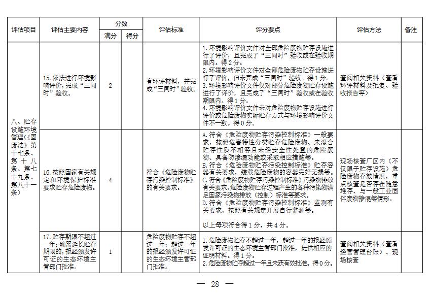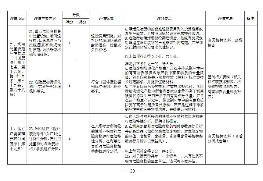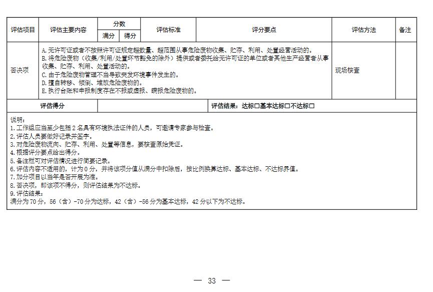 (一)國家評估。生態(tài)環(huán)境部每年按照《危險廢物規(guī)范化環(huán)境管理評估指標》(以下簡稱《評估指標》,見附件 1),結合統籌強化監(jiān)督等,現場評估部分?。▍^(qū)、市)上年度危險廢物規(guī)范化環(huán)境管理情況。