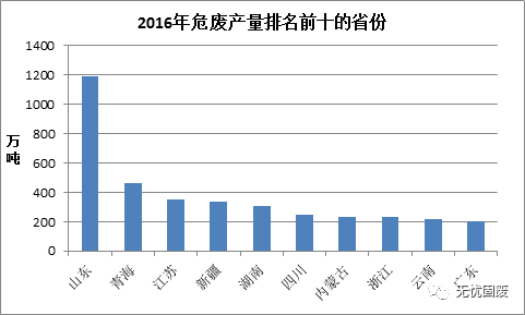 ? ? 其中山東危廢產(chǎn)生量最多,高達(dá)1188.28萬(wàn)噸,其次是青海,產(chǎn)生量為462.05萬(wàn)噸,江蘇危廢產(chǎn)生量為350.98萬(wàn)噸,排名第三。