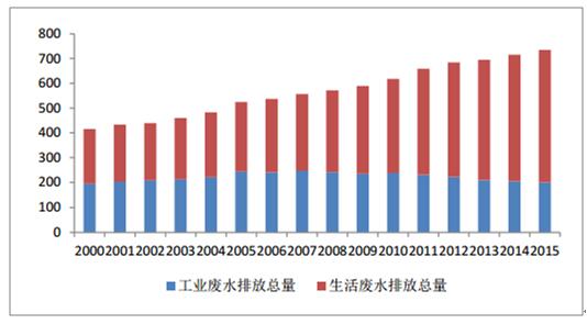 2000-2016年全國廢水排放結(jié)構(gòu)(億噸)