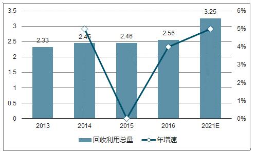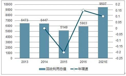 ? ? 十大廢棄物回收利用量變化相對(duì)穩(wěn)定,年增速在0%-5%,回收利用總值受大宗商品價(jià)格變化而波動(dòng)較大。2016年,我國(guó)十大類(lèi)別的再生資源回收總量約為2.56億噸,同比增長(zhǎng)3.7%,回收總值約為5902.8億元,同比增長(zhǎng)14.7%。預(yù)計(jì)到2021年,我國(guó)主要再生資源利用總量將達(dá)到3.25億噸,復(fù)合增速5%,再生資源回收價(jià)值達(dá)到9506.52億元,復(fù)合增速10%。