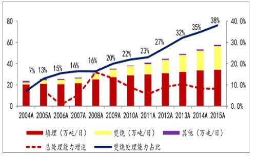 ? ? 2004年以來,我國生活垃圾處理能力穩(wěn)步提升,其中大部分增量來自于焚燒處理。焚燒處理能力占比由2004年的7%增長至2015年的38%。我國2020年末生活垃圾焚燒處理能力需要從2015年末的23.52萬噸/日增長至59.41萬噸/日。焚燒所占總垃圾處理能力的比例由2015年的31%上升至2020年的54%。假設(shè)處理能力每年增量相同,則2016-2020年每年需要增加7.18萬噸/日的垃圾焚燒處理能力。