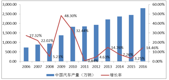 ? ? 近年來,以中國為代表的發(fā)展中國家的汽車行業(yè)發(fā)展迅速,從 2001年到 2008年,中國汽車工業(yè)產(chǎn)銷平均每年跨越一個(gè) 100 萬輛臺(tái)階。2009 年我國新車產(chǎn)銷量躍居世界第一,并保持至今,汽車工業(yè)已毫無爭議地成為我國國民經(jīng)濟(jì)的支柱產(chǎn)業(yè)。中國的汽車產(chǎn)量在 2014 年、2015 年和 2016 年分別為2,372.29 萬輛、2,450.33 萬輛、2,811.88 萬輛,同比分別增長 7.26% 、3.25% 和14.46%。