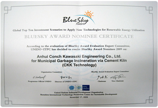 2009年11月17日,該技術(shù)獲得聯(lián)合國 2009年度全球可再生能源領(lǐng)域最具投資價(jià)值的領(lǐng)先技術(shù)“藍(lán)天獎(jiǎng)”提名獎(jiǎng)。